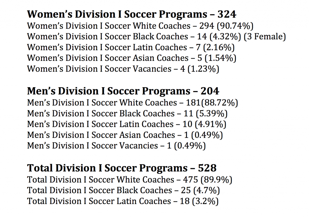 Justin, a member of the Black Soccer Coaches Association, gathered data from 1,862 NCAA soccer programs. He initially set out to gather data about racial diversity, but in doing so, he developed a comprehensive spreadsheet that now contains much, much more information. For example – out of 1,021 women’s NCAA soccer programs – 662 of them are coached by men. And out of over 800 men’s NCAA soccer programs – only 1 is coached by a female.